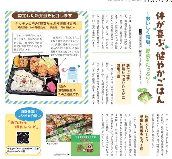 キッチンのぞみは小田原市の健康づくり課と協力し、一番人気の唐揚げ弁当をさらにヘルシーにした「野菜たっぷり唐揚げ弁当」をメニューラインナップに加えました。いつもの唐揚げ弁当の塩分を減量・野菜量を増量!