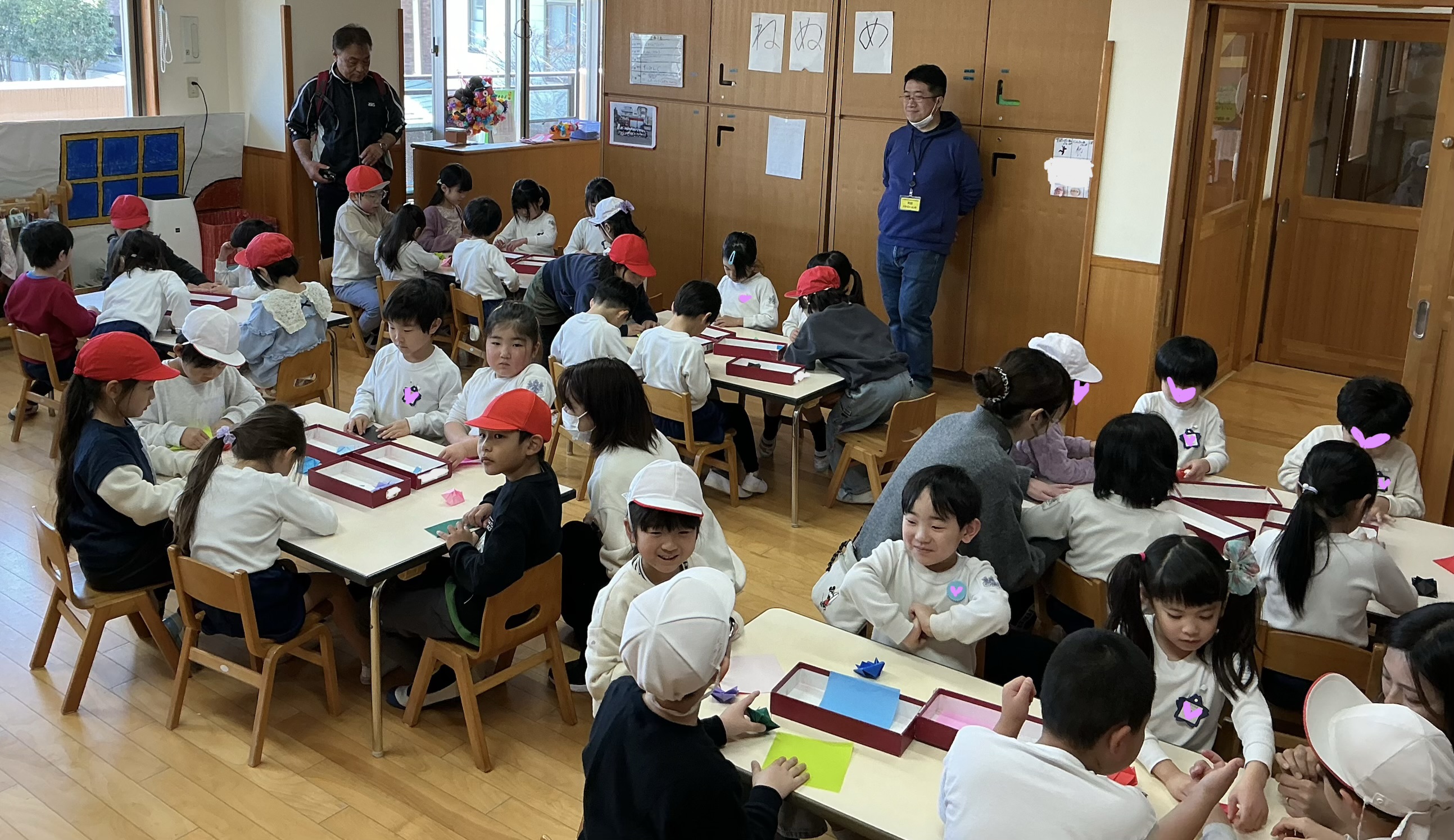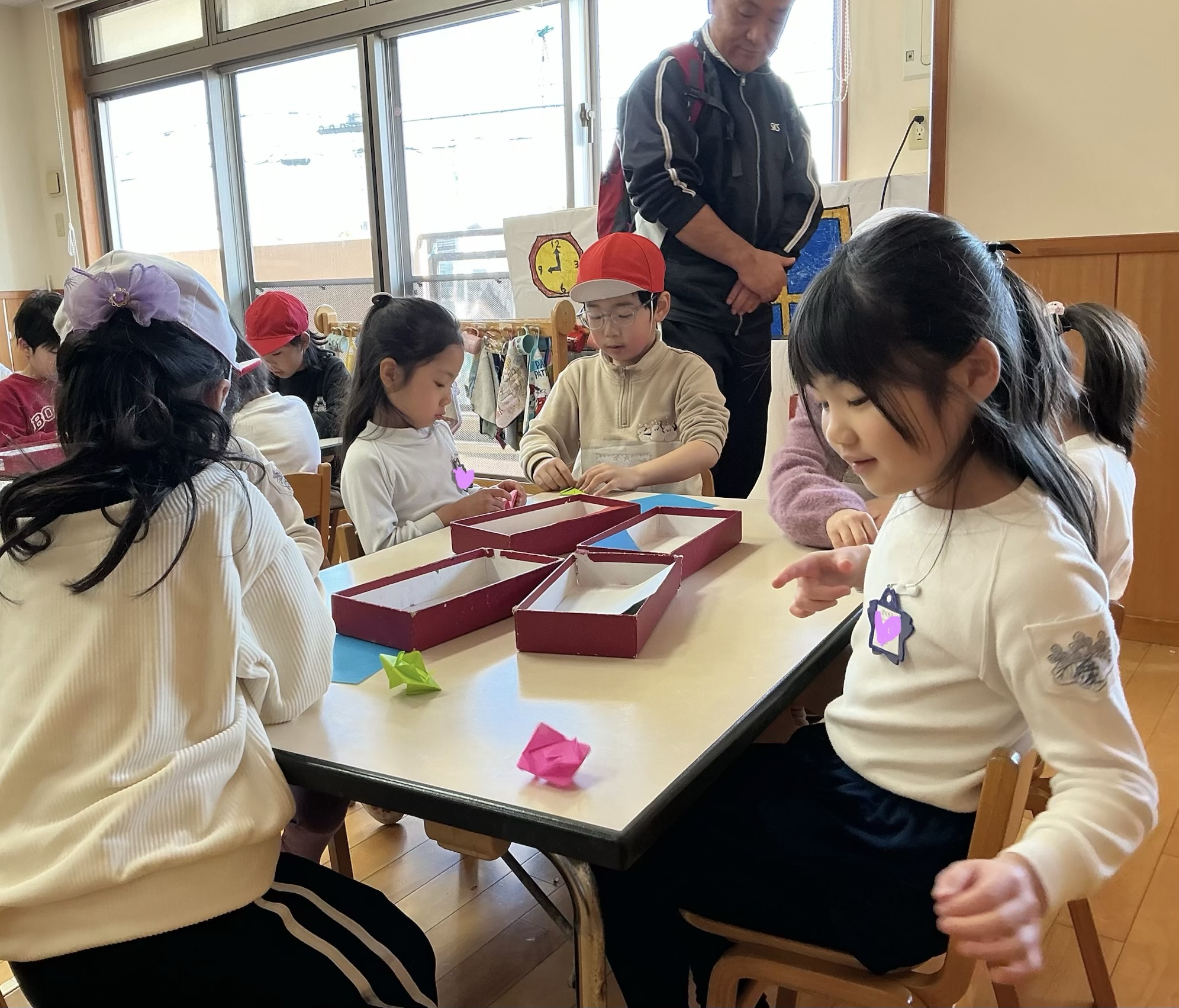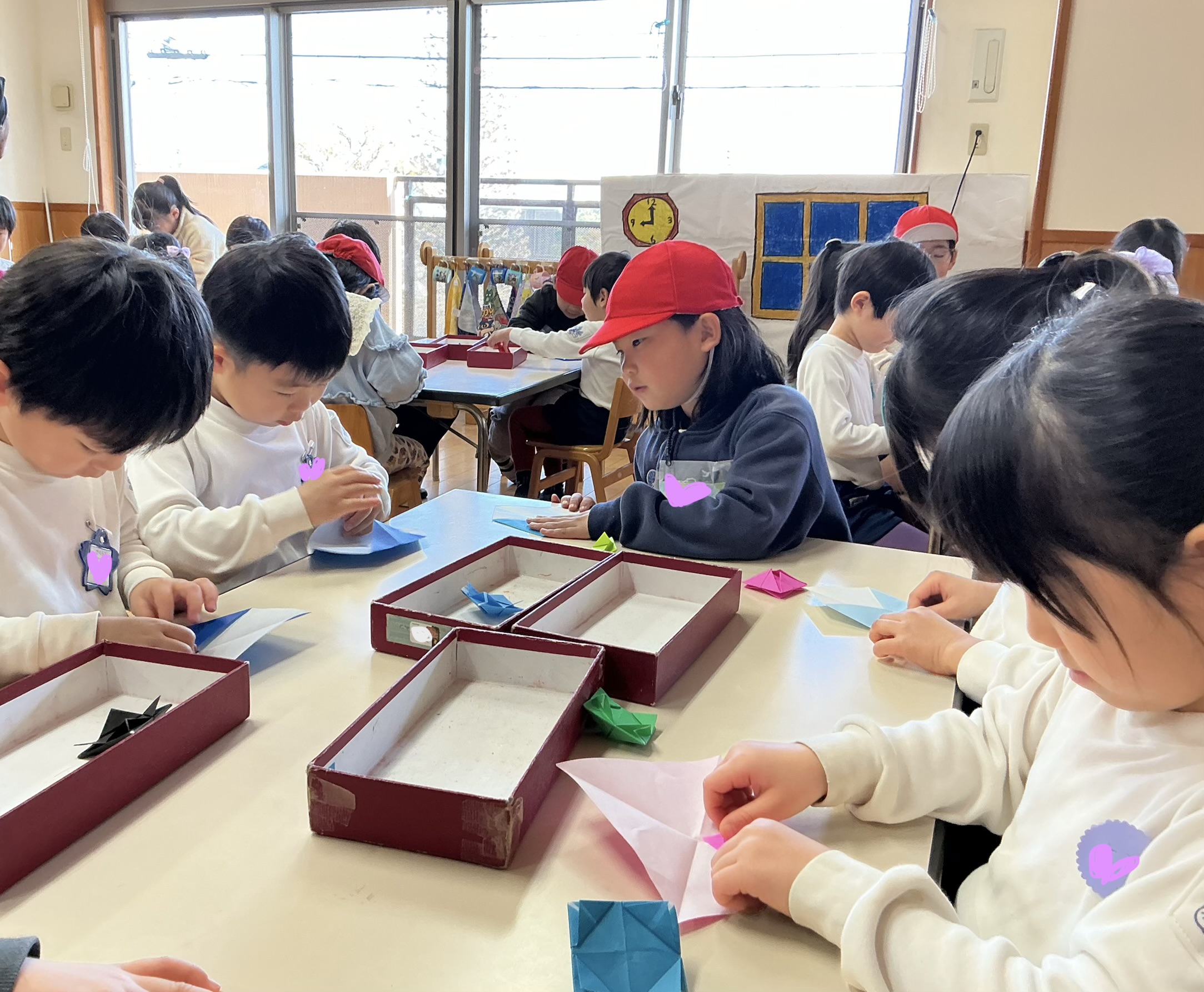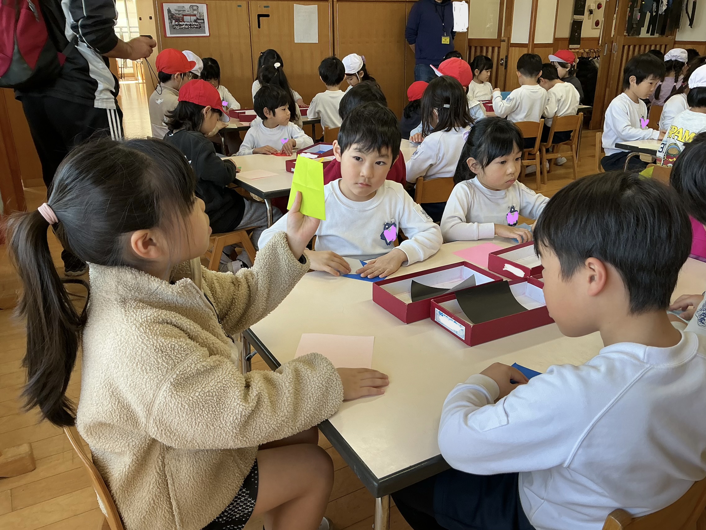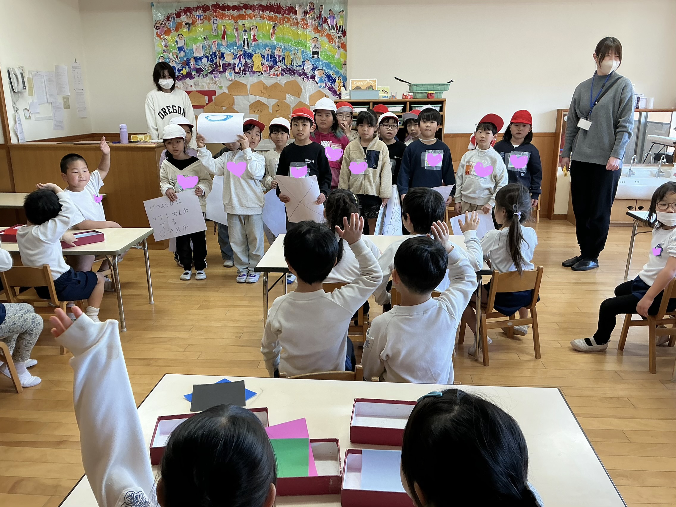 教室で学校クイズと折り紙をしようね」