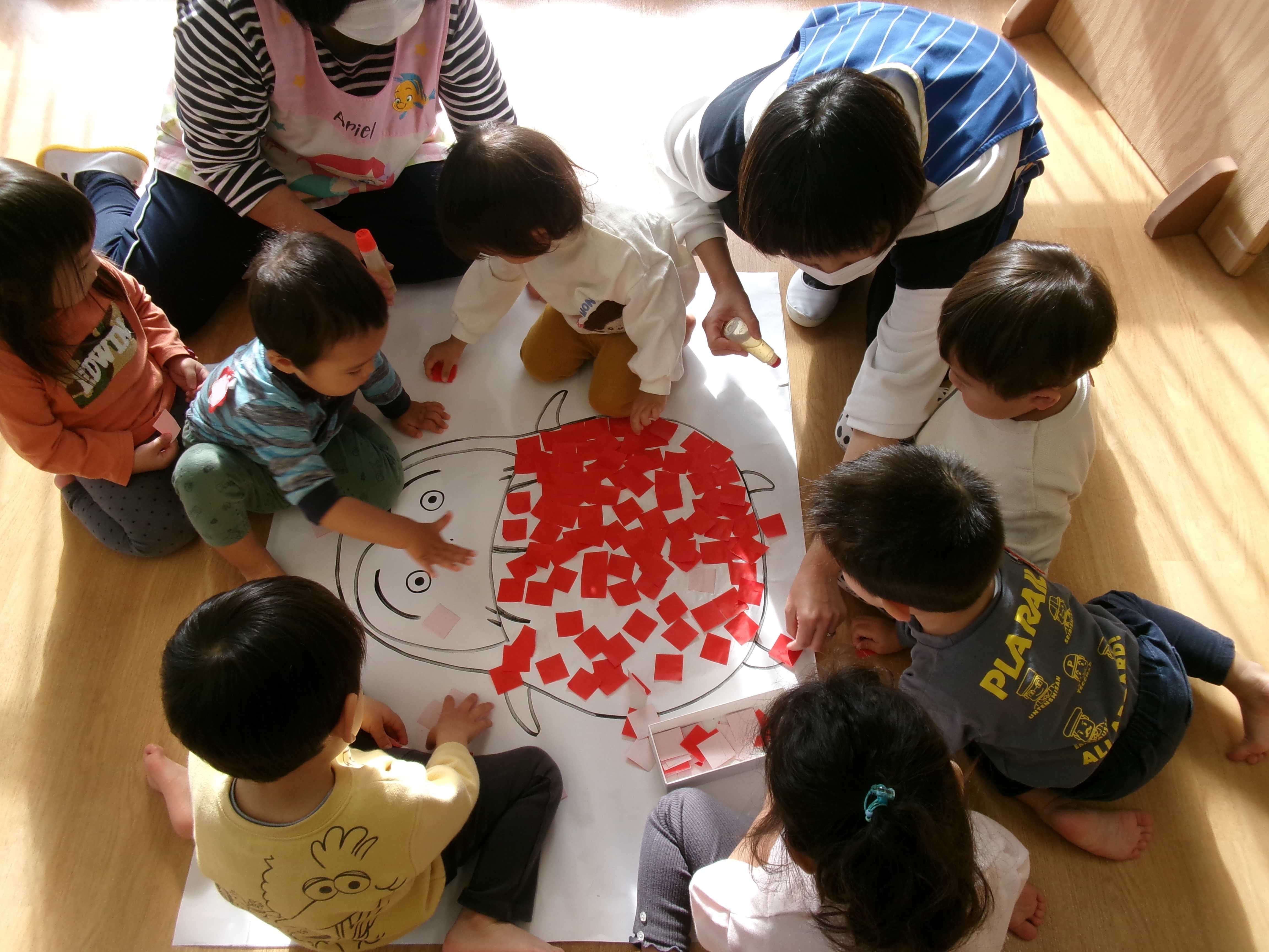 赤い折り紙をペタペタ